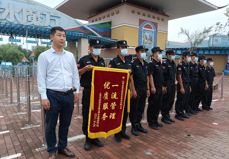 9月5日下午,我司收到北京华旅欢乐水魔方嬉水乐园有限公司送来写有“一流管理,优质服务”的致谢锦旗,这是对我司安保工作致以最崇高的敬意。一面锦旗,看似简单,但它凝聚着人民群众对安保人员的莫大鼓励,安保人员纷纷表示,赠送的锦旗既是鼓舞,更是鞭策。